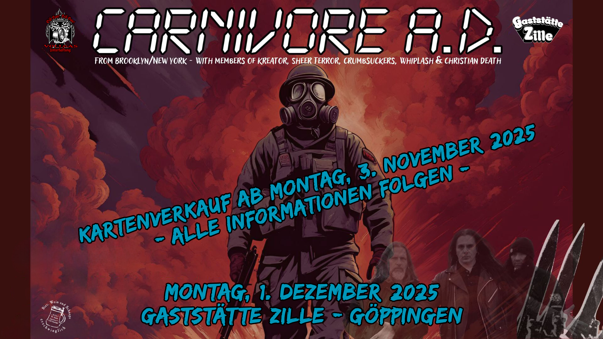 Das CARNIVORE A.D. Konzert am Donnerstag 28. November 2024 ist restlos AUSVERKAUFT.